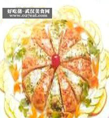 3)鸡胸肉扑点太白粉,将虾仁置于鸡胸肉上, 入热油锅中小火炸至色泽金黄取出沥干切块。 (文/伊迪文化传播供稿)